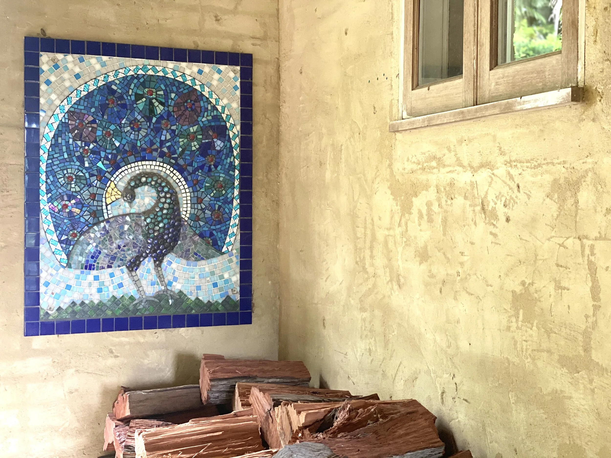 The most prominent mosaic at Villa Rustica is a larger-than-life peacock created by English artist and friend, Martin Cheek. You will meet Luke, the peacock, hiding behind raphis palms on your way from the house to the gallery. He’s made of fused dichroic glass that sparkles in the evening light. Visitors often pause to stroke and look carefully at him as they wander past – which is fitting given we spent five (nervous) days installing him!