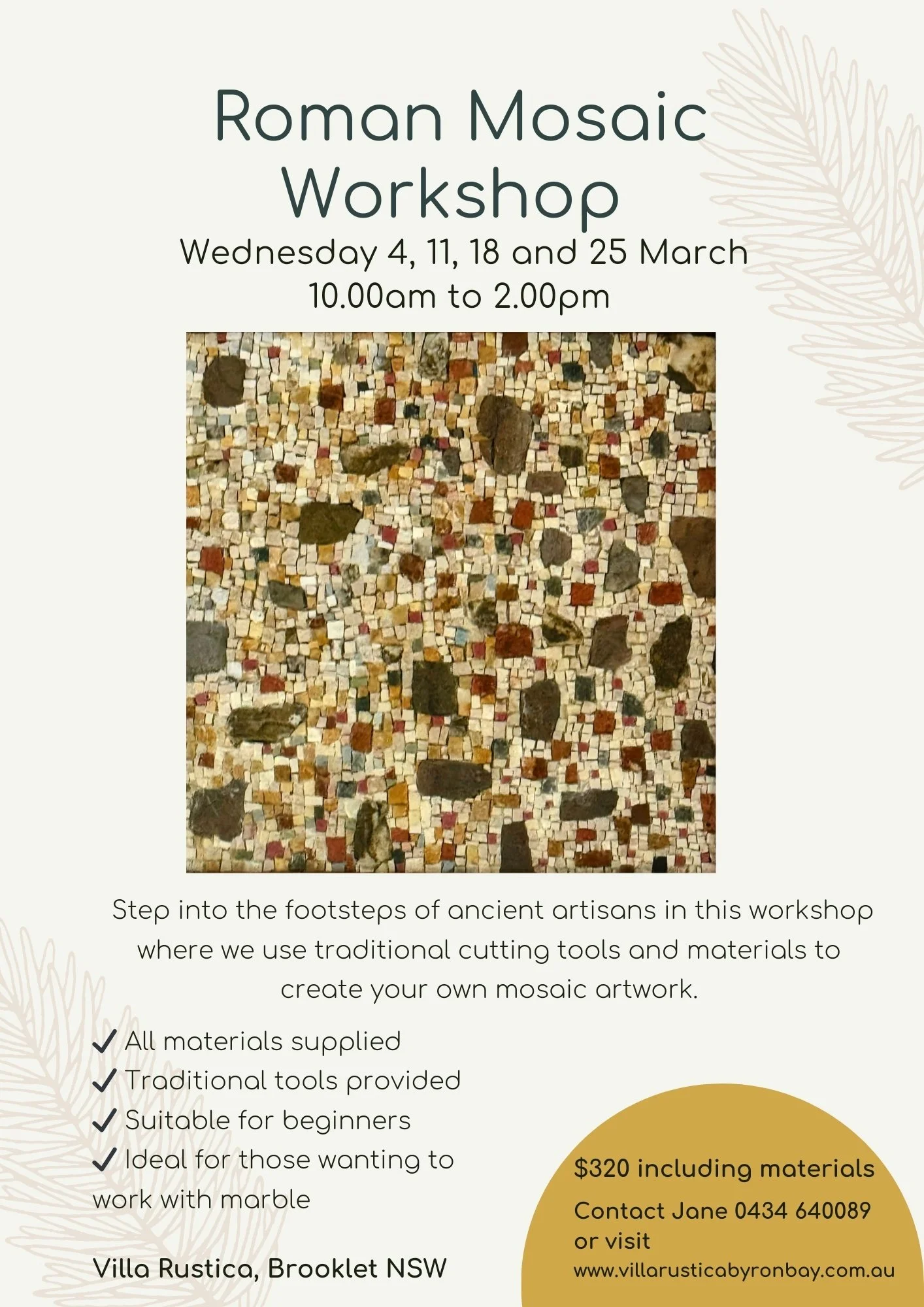 If you’re after a fun learning experience, I recommend attending a workshop at Villa Rustica. I’ve attended several pottery, candle making and mosaic courses! The courses are well structured and organised, and I’ve come away with lots of information and a completed artwork.